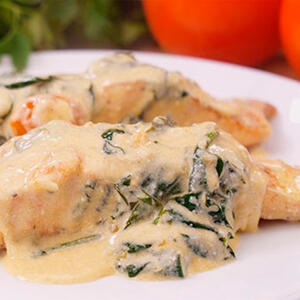 SALMON EN SALSA DE QUESO TOMATE Y ESPINACAS