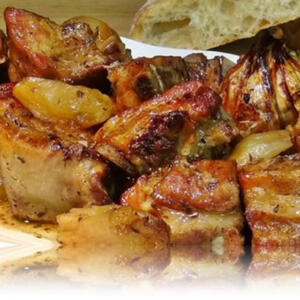 - Sal al gusto.PreparaciónComenzaremos pelando las papas y cortarla en trozos, pelamos la cebolla y cortamos en pedazos medianos.Luego en una sartén que sea resistente al horno, agregamos aceite de oliva, freímos las costillas de cerdo, la cebolla, el chorizo cortado en trozos y la panceta hasta que se cocine, no del todo cocidas.